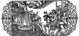 The line next goes to Sigurd’s son Ragnar, King of Denmark, born 750, who is pictured below in baggy pants slaying a beast. Then the line merges with one of Ragnar’s sons. Eric Weatherhat (pictured below, controlling the winds so that the ship turns in his direction), with Eric II King of Denmark, pictured below to the right. Horik II (who died after 864), also known as Hårik or, in late sources, Erik Barn (Danish: “Erik the Child”), was King of the Danes from the fall of Horik I in 854 to an unknown date between 864 and 873. These names come from Gesta Danorum (“Deeds of the Danes”) by Saxo Grammaticus, which is the most extensive and widely known Danish chronicle of Danish kings. However, they list Eric, the great-grandson of Ragnar, which means it’s missing two generations, which speeds up the descent.